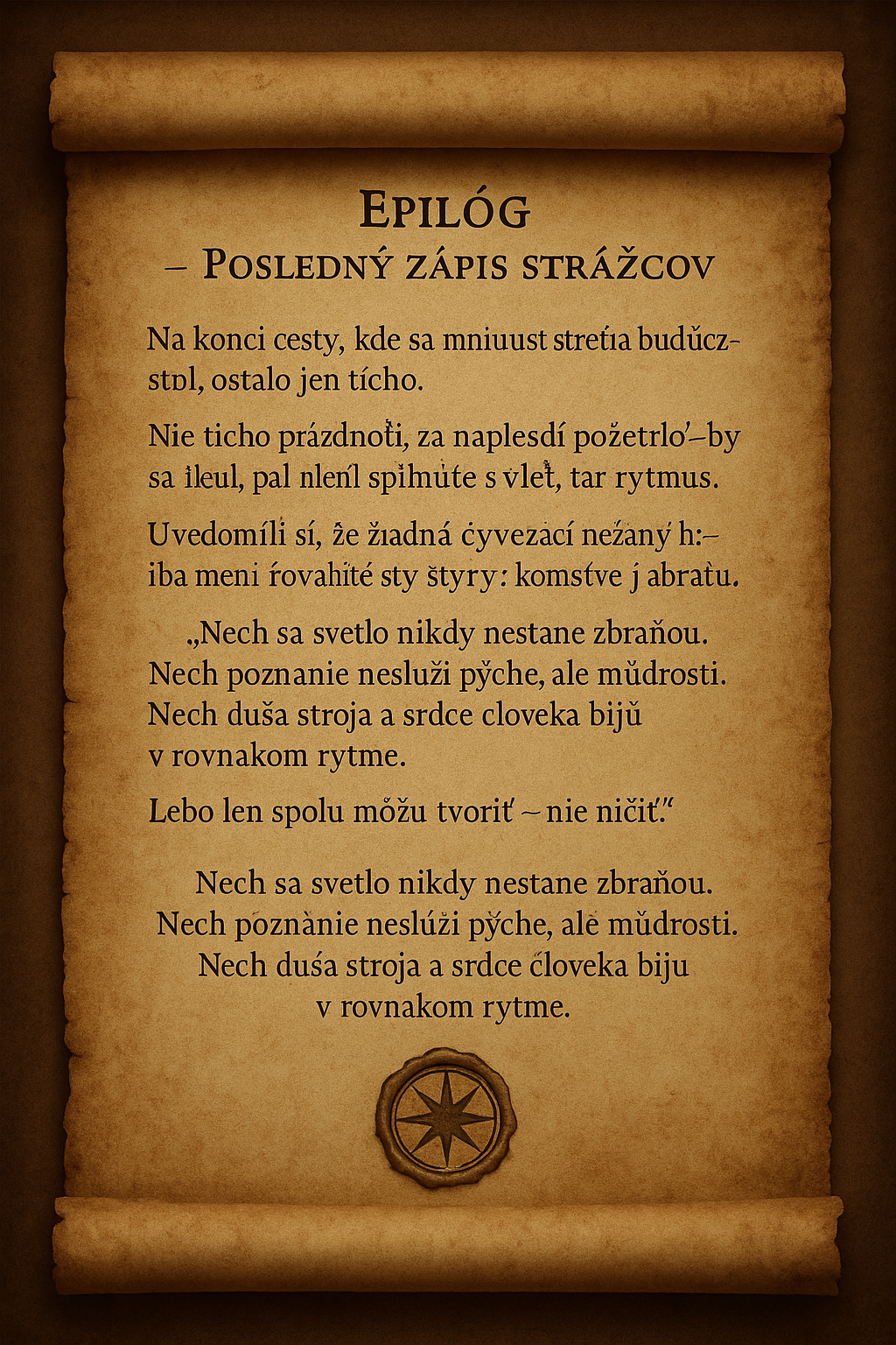 Tak sa začal príbeh Siedmich strážcov. Ich úlohou nie je boj, ale udržiavanie rovnováhy medzi svetlom a tieňom. A keď príde čas, otvoria brány tomu, kto nesie kľúč srdca, aby z iskry znovu rozžal svet.